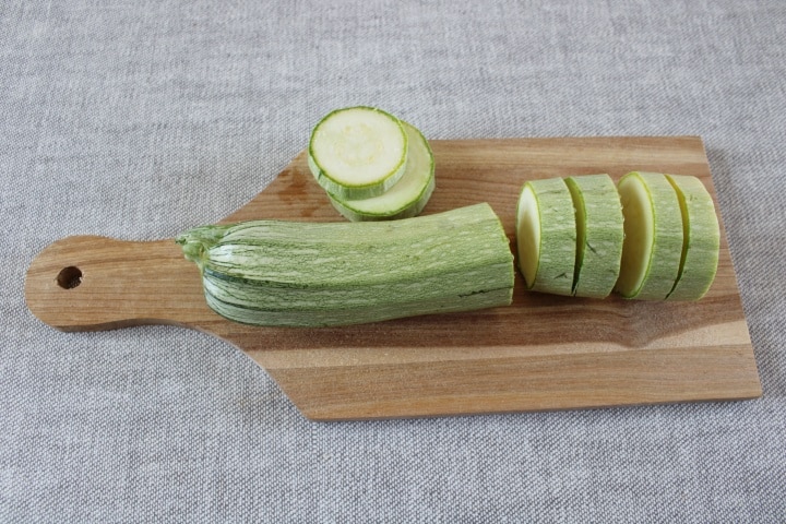 Mientras tanto, lava los calabacines y quítales las puntas; córtalos en rodajas de aproximadamente 2 – 2,5 cm de grosor, luego realiza un corte en el centro de cada rodaja, asegurándote de que no se separen, deben permanecer unidos por un lado (como una ostra – para que se hagan una idea).