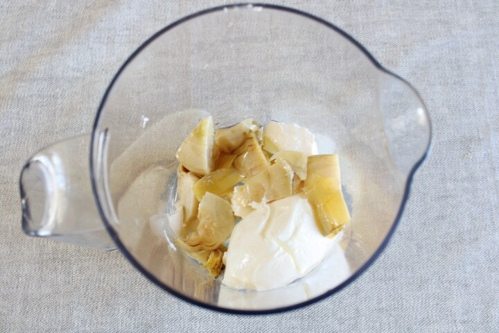 Primero, bate bien las alcachofas junto con el queso crema (yo usé Philadelphia) con una batidora de mano hasta obtener una crema homogénea sin trozos.