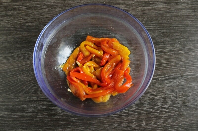 En un bol, sazona los pimientos en tiras con un generoso chorro de aceite de oliva virgen extra, sal, pimienta y, si prefieres, un diente de ajo entero machacado (que puedes retirar antes de servir) y un poco de perejil fresco picado. Deja reposar durante al menos 15-20 minutos.