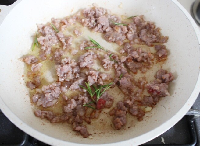 Primero, quitad la piel a la salchicha y desmenuzadla, aplastándola con un tenedor; ponedla en una sartén con 3 cucharadas de aceite de oliva virgen extra y 1/2 cebolla picada y algunas ramitas de romero, y hacedla dorar por algunos minutos.