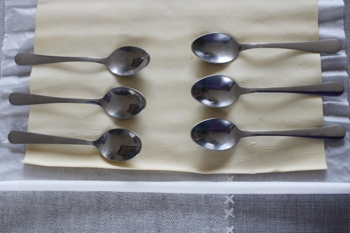 Primero, sacad la hojaldre de la nevera, dejadla unos minutos a temperatura ambiente, desenrolladla y colocad encima las cucharillas de acero que os servirán para darle forma.