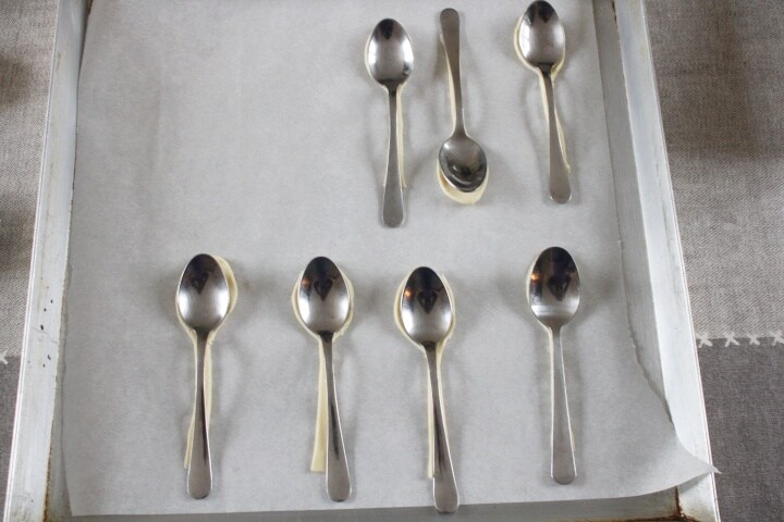 Mientras tanto, encended el horno a 200°C, en modo «ventilado». Hornead por unos 5 minutos. Controlad la cocción, deben estar bien doradas. Dejad enfriar, luego retirad cuidadosamente la cuchara.