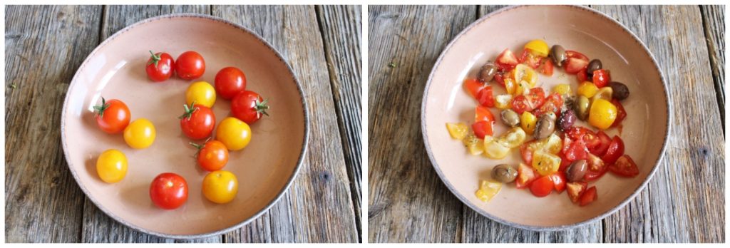 Mientras tanto, lava los tomatitos, sécalos con un paño de cocina, córtalos en cuartos y colócalos en un plato junto con las aceitunas (si quieres córtalas en rodajas), sazona con el aceite de oliva virgen extra y el orégano, y ajusta de sal.