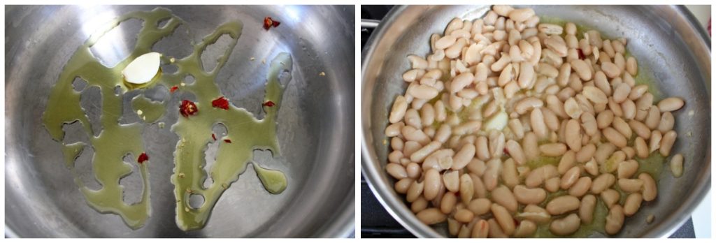 Mientras tanto, calienta en una cazuela el aceite de oliva virgen extra y sofríe en él el diente de ajo y la guindilla (si te gusta), luego añade los cannellini precocidos y 2 cucharones de agua de cocción de la escarola. Ajusta de sal, mezcla y deja que se sazone durante unos minutos (unos 5-7 minutos).
