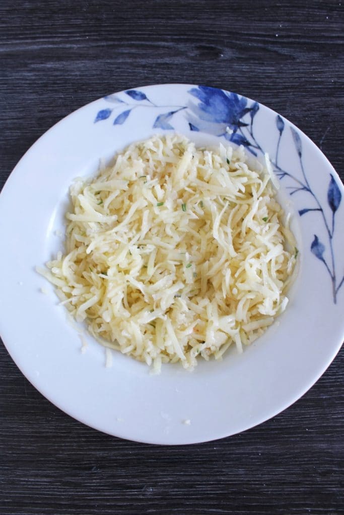 Primero, pela las patatas, lávalas y rallalas con un rallador de agujeros medianos o grandes, o con un picador de verduras eléctrico: escúrrelas para eliminar el agua.