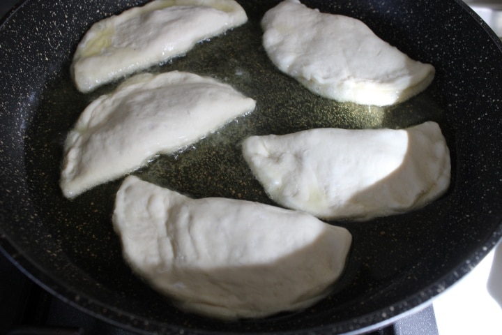 La preparación es muy sencilla y rápida. En efecto, se trata de una masa fermentada, la de la masa para la pizza, que se deja leudar hasta el doble y luego se corta en rombos (o en mi caso, en círculos, que se rellenan) y se fríen.