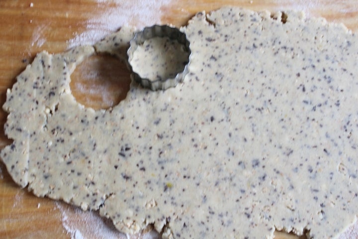 Estiren la masa con el rodillo en una lámina de un grosor de aproximadamente 0,4 – 0,5 cm. Para obtener un grosor uniforme he colocado espaciadores a los lados de la masa y luego la he extendido con el rodillo. Si ven que tiende a desmoronarse, trabajenla un poco con las manos antes de extenderla.