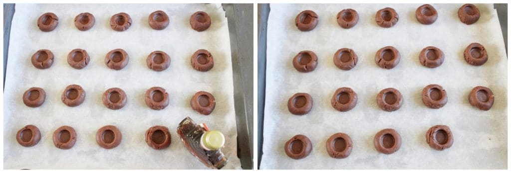 Presiónalos en el centro (con una tapa como lo hice yo o con el pulgar) y hornéalos, en el horno ya caliente, durante unos 12 – 13 minutos, depende del tamaño de tus galletas.