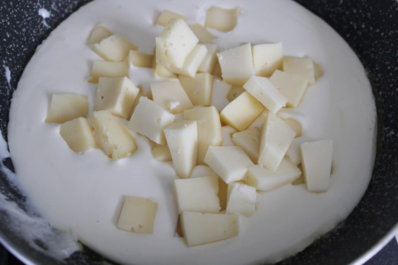En una sartén o cazo grande, calentad a fuego muy bajo la nata líquida junto con una nuez de mantequilla. Apenas la nata esté bien caliente, añadid los cubitos de Toma y Fontina; remover suavemente con una cuchara de madera o una varilla.