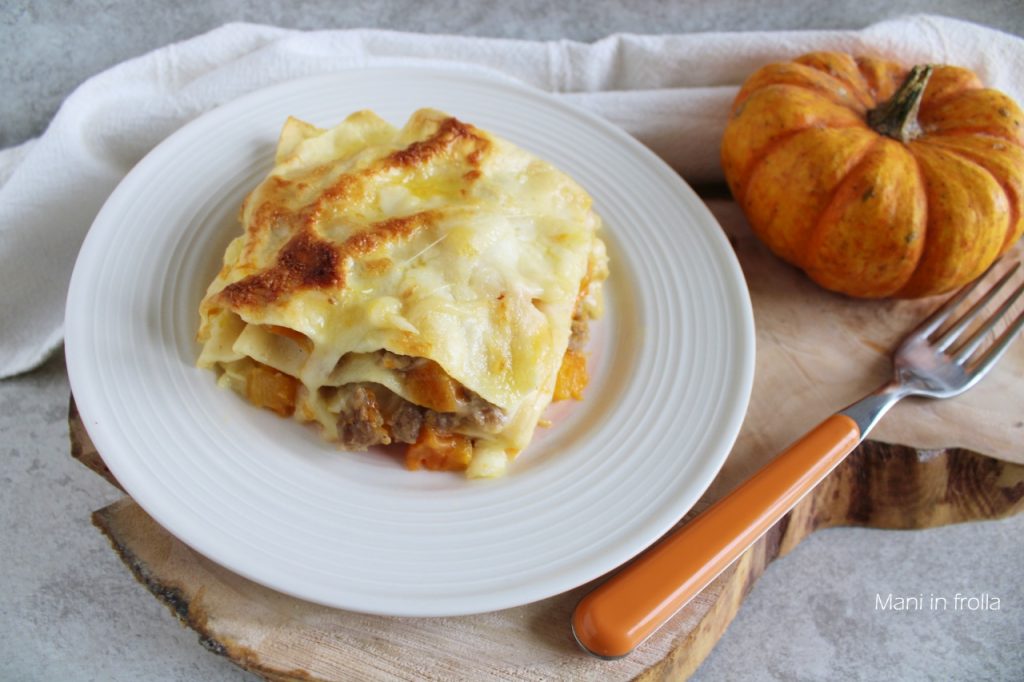 Lasaña al horno con Calabaza y Salchicha, un excelente primer plato perfecto para la temporada de otoño, cuando las calabazas están en su máximo sabor.
