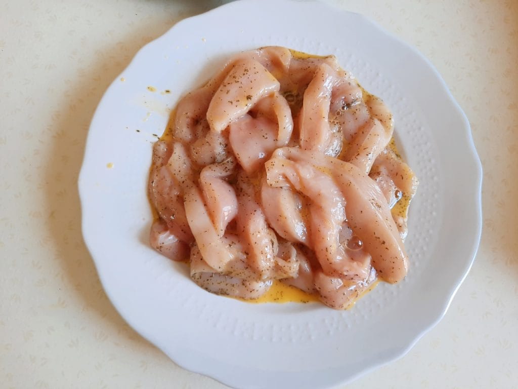 • Corta la pechuga de pollo en tiras del tamaño que desees sobre una tabla de cortar.