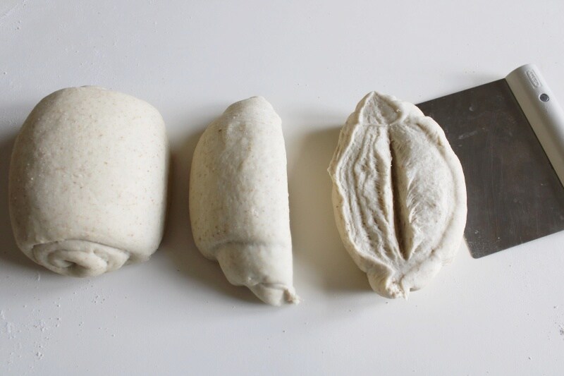 • Pasado el tiempo de fermentación, dividid cada panecillo en 2, poned el centro hacia arriba y estiradlo ligeramente con las manos.