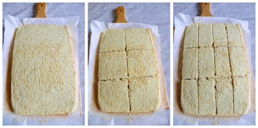 Una vez frío, córtalo con un cuchillo: yo he obtenido 12 piezas rectangulares (así que 6 parejas). Elige tú la forma. Si prefieres, también puedes usar un cortapastas redondo.