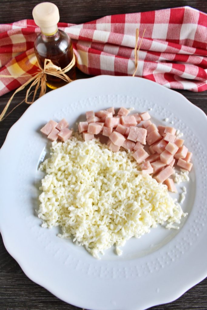 Mientras tanto, rallad el queso (para hacerlo rápido utilizo siempre este rallador eléctrico que además es excelente también para cortar verduras) y cortad el jamón en dados (o utilizad el que ya está listo).