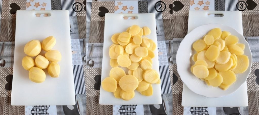 Primero pelad las patatas (1). Lavadlas bajo el agua corriente, secadlas con un paño y con un cuchillo afilado cortadlas en rodajas finas (2). Escaldadlas en agua hirviendo durante unos minutos (alrededor de 5 minutos). Escurridlas y dejadlas enfriar (3).