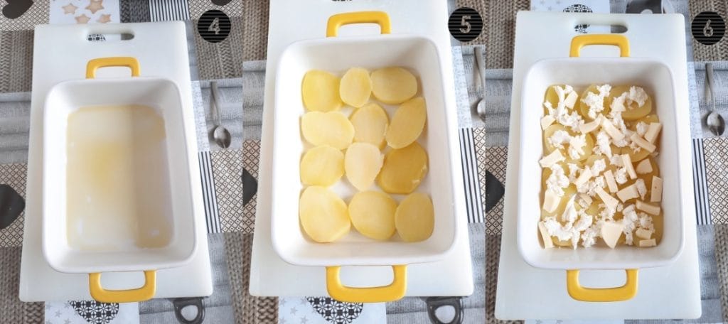 Engrasad una fuente para horno (4) con aceite de oliva virgen extra (también vale el de oliva). Colocad en la fuente (5) las patatas en rodajas, sal, rociad con el aceite y añadid 1/3 del queso en cubos (6) y el parmesano rallado.