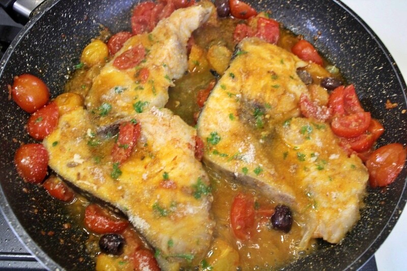 – Si lo prefieres, también puedes cocinarlo en el horno de esta manera: coloca las rodajas de pez espada en una bandeja, condimenta con la salsa de tomatitos y cocina en el horno precalentado a 180°C durante unos 15 minutos.