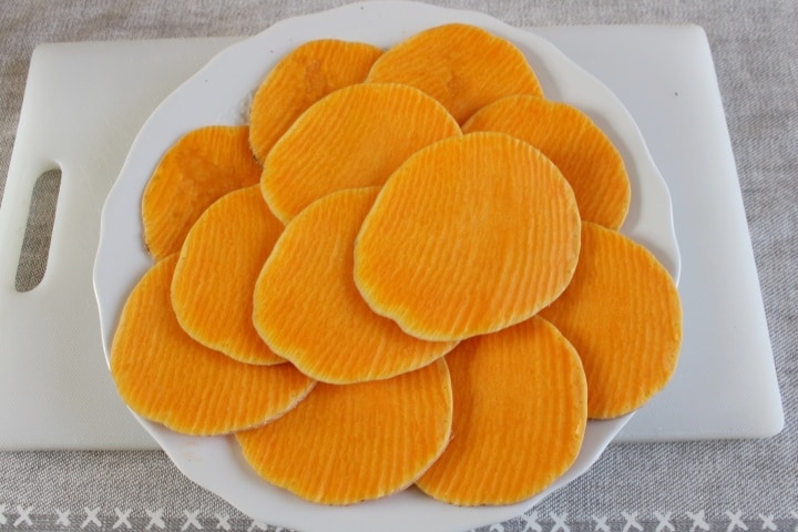 • Yo usé la rebanadora y las rodajas me quedaron todas iguales. Si os cuesta cortarla con el cuchillo, mejor quita la piel primero.