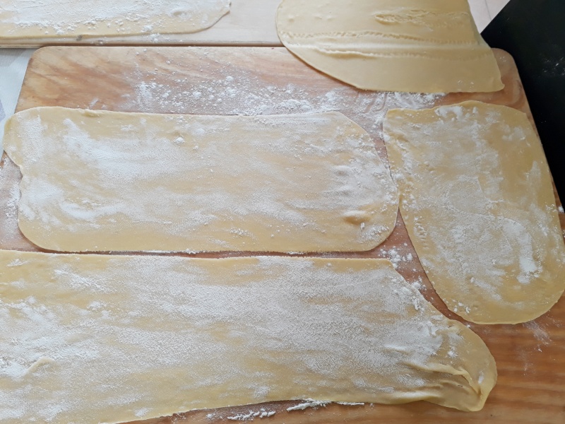 • Con la amasadora: pasa el bloque entre los rodillos (un trozo a la vez), comenzando por el grosor más ancho hasta llegar al penúltimo o antepenúltimo ajuste. Pásalo varias veces, luego reduce gradualmente el grosor, hasta obtener el deseado. La reginette no debe ser tan fina como un tortellini, debe tener algo de consistencia.