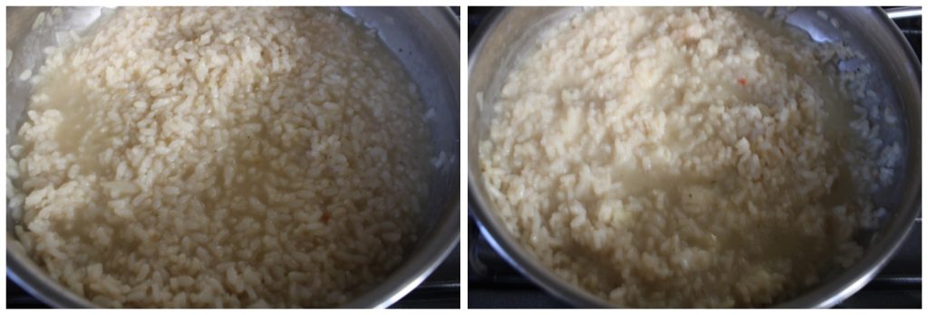 Desglasadlo con el vino blanco y dejadlo evaporar. Cuando el vino se haya secado, continuad la cocción, añadiendo un poco a la vez el caldo hirviendo y removiendo de vez en cuando para que no se pegue. Añadid el caldo solo cuando el precedente haya sido absorbido.