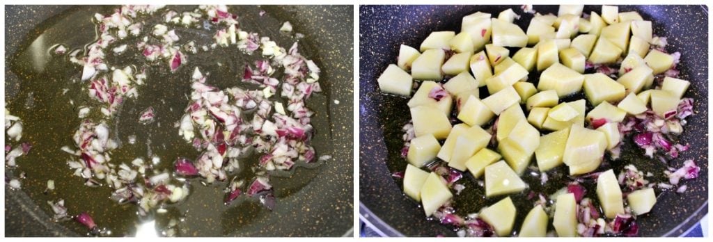 En una sartén grande o cacerola, calienta un generoso chorro de aceite de oliva virgen extra a fuego lento, añade la cebolla finamente picada junto con el ajo, la guindilla y sofríe por aproximadamente 1-2 minutos, teniendo cuidado de no quemarlos, luego añade las patatas, déjalas tomar sabor.