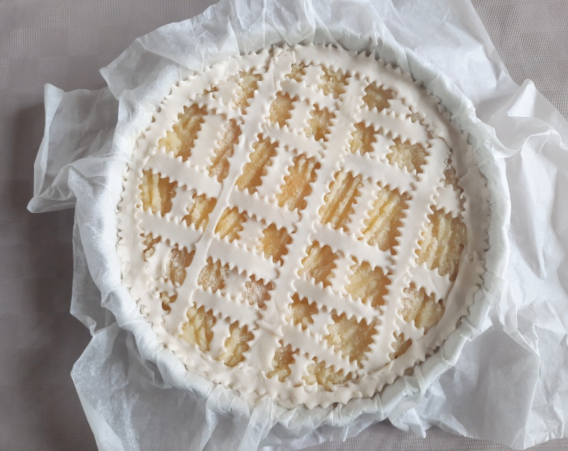 Con el hojaldre sobrante, corta tiras con la rueda adecuada y colócalas en la superficie como si fuera una tarta.