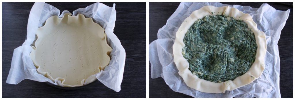 • Luego, desenrolla el hojaldre y colócalo con su papel en un molde de bordes altos (22 – 24 cm). Pica el fondo con los dientes de un tenedor, luego vierte dentro la mezcla de ricotta y espinacas: con una cuchara crea cuatro huecos para insertar los huevos.