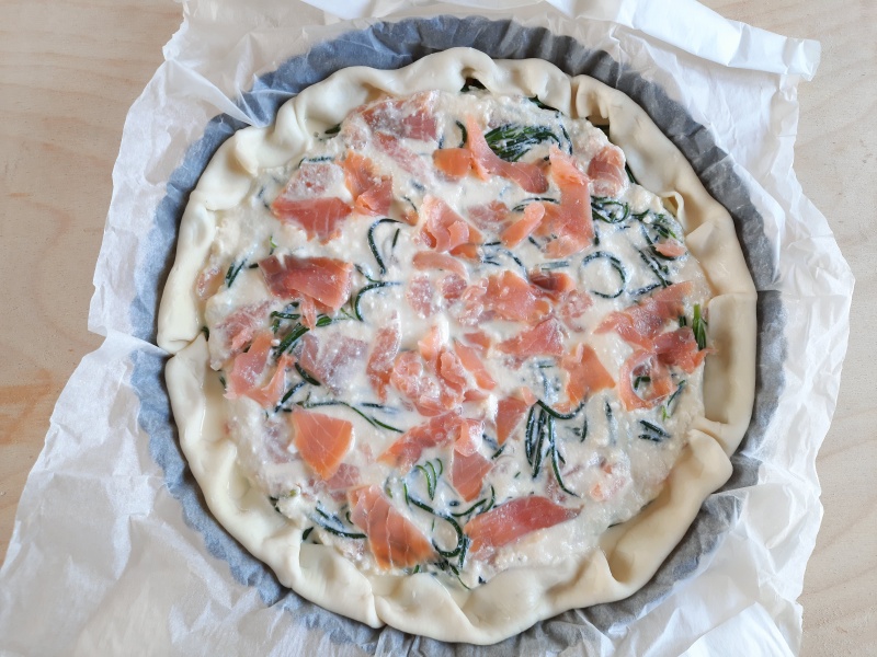 – Añade el salmón ahumado crudo (en roseta o en tiras) solo después de la cocción. El calor residual de la tarta lo templará ligeramente, manteniendo intacto su sabor delicado que, si se cociera en el horno, quedaría demasiado salado.