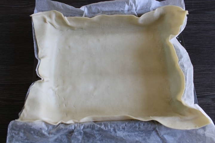 Después, coloca el hojaldre con su papel de hornear dentro de una bandeja rectangular y, con los dientes de un tenedor, pincha el fondo: así la masa no se inflará durante la cocción.