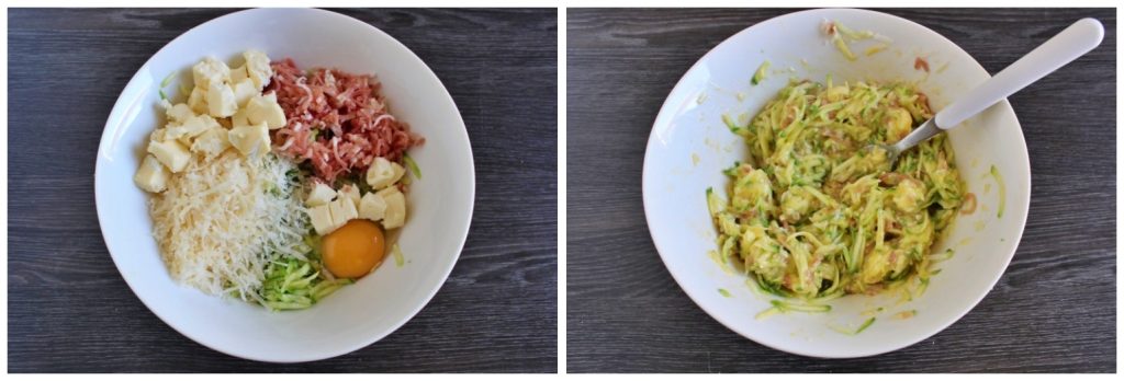 En este punto, coloca los calabacines exprimidos en un bol (o en un plato hondo), añade los huevos, el queso rallado, el brie cortado en cubitos, el speck finamente cortado, la sal y la pimienta; mezcla todo bien.