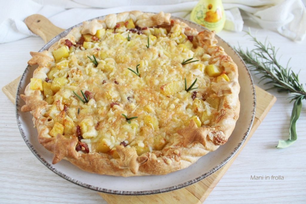 Una cáscara crujiente de hojaldre, o si prefieres de masa brisée, encierra un relleno suave y envolvente: las patatas cortadas en cubos se mezclan con el sabor intenso y ahumado del Speck. El toque final lo da el abundante queso que, al derretirse en la cocción, hace que cada porción sea cremosa e inolvidable.