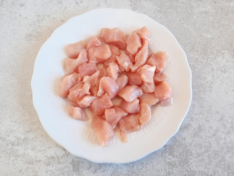 Primero, corta la pechuga de pollo en cubos (trocitos) de aproximadamente 2-3 cm.