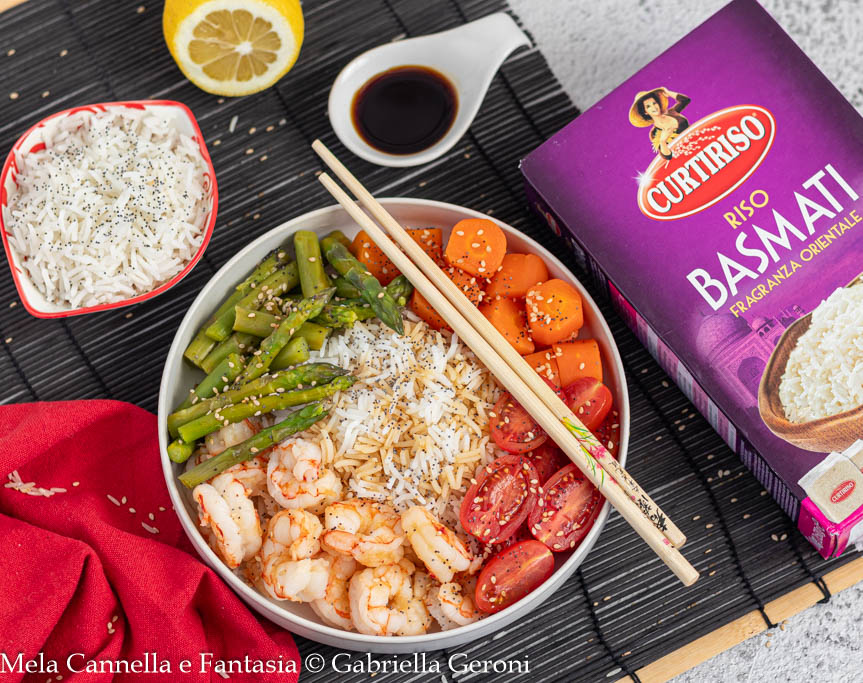 El bowl de arroz se puede considerar un plato sano y equilibrado. Para ser considerado tal, sin embargo, debemos prestar atención a la elección de los ingredientes para garantizar dicho equilibrio. Yo he usado como fuente de carbohidratos el arroz, para la parte proteica (una sola) las gambas, y luego un mix de verduras (espárragos, tomates cherry y zanahorias) ricas en fibra y vitaminas.