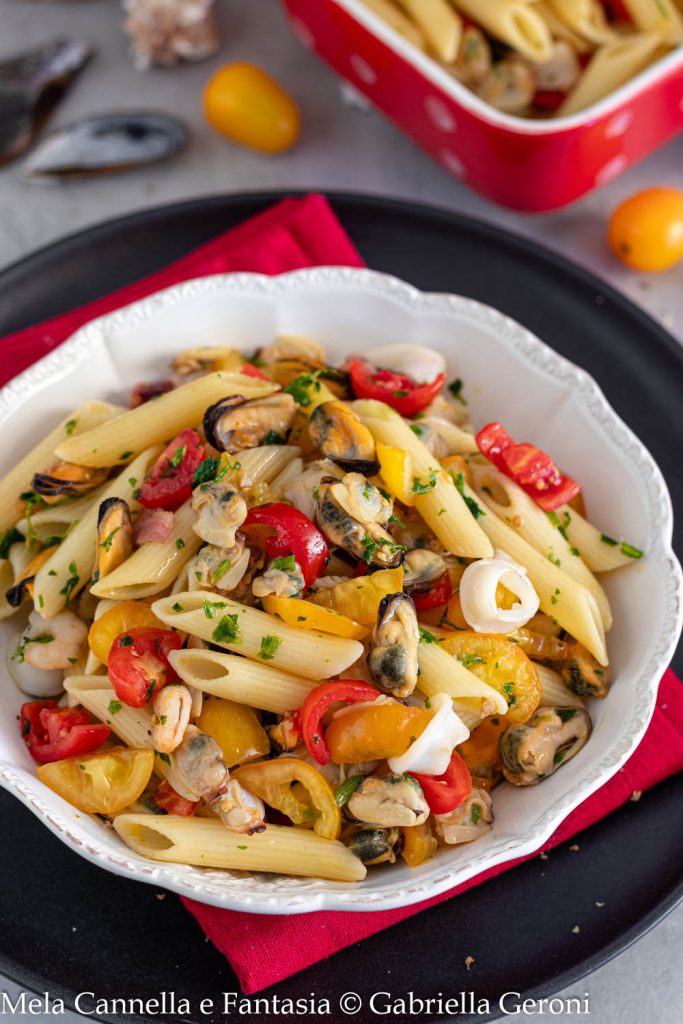 La ensalada de pasta con marisco es un primer plato veraniego fresco y ligero. Se prepara con pasta corta, tomates cherry y una mezcla de mariscos (congelados o frescos). Basta con cocer los mariscos en la sartén con ajo y aceite, condimentar la pasta ya enfriada y dejarla reposar en el frigorífico durante al menos 30 minutos antes de servirla.