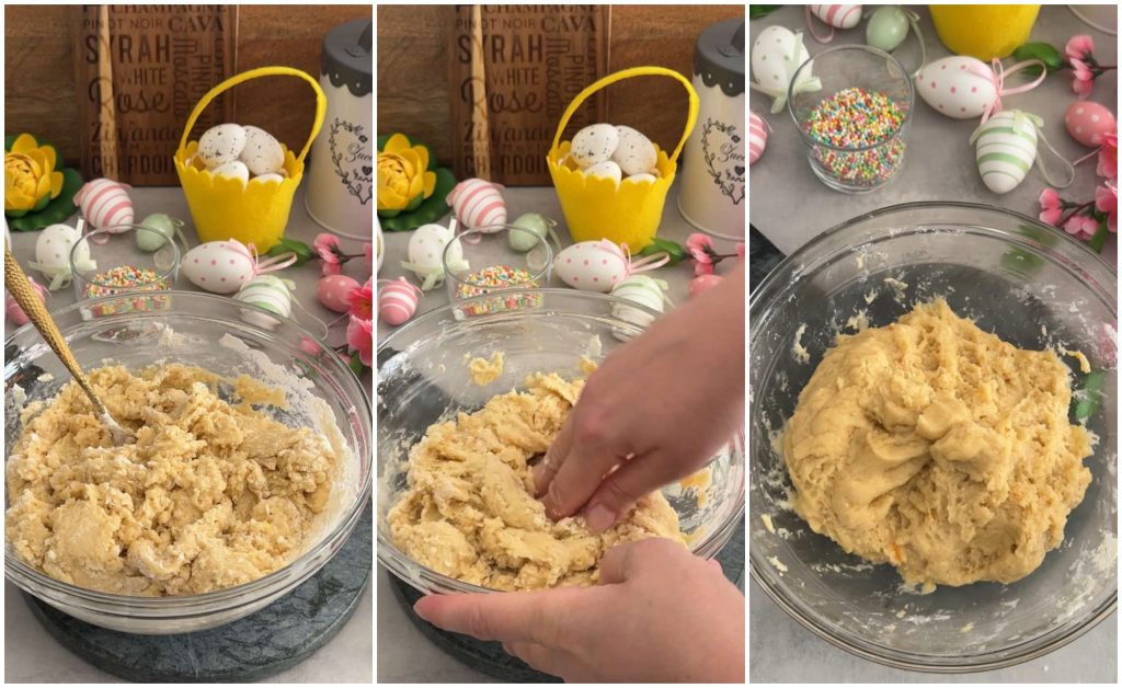 Debes obtener una mezcla ligeramente pegajosa, así que, por favor, no añadas más harina.