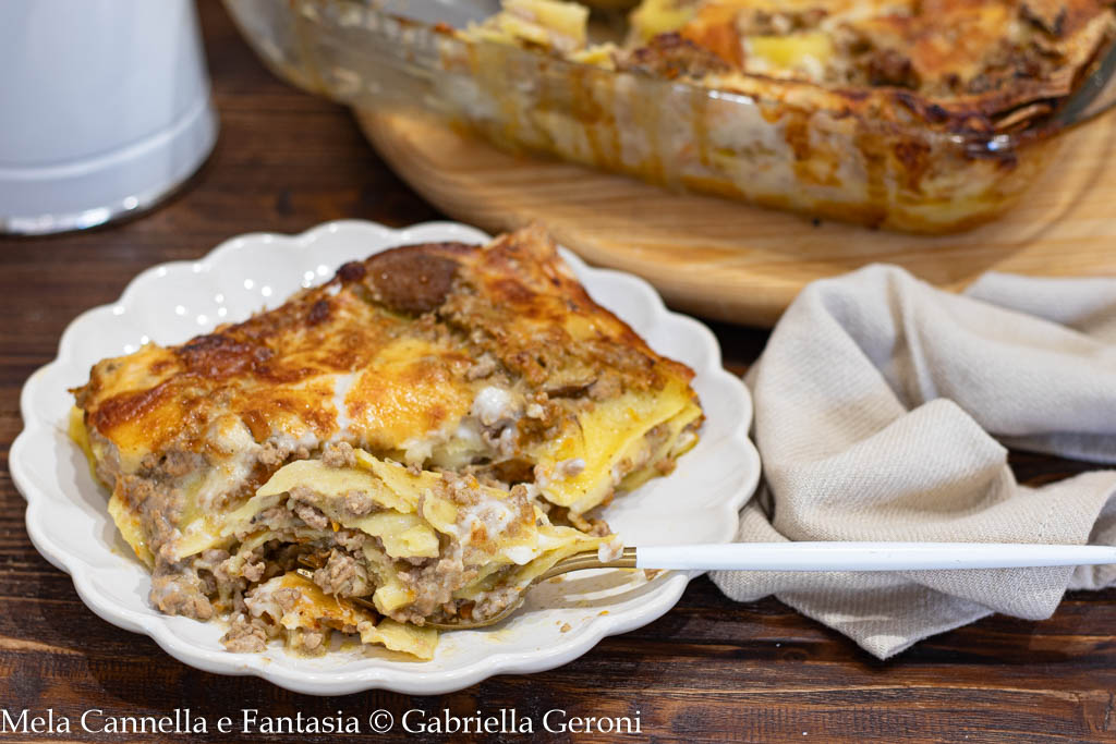 Además de la clásica y tan amada lasaña al ragú, nos gusta mucho la lasaña blanca. La preparo con un ragú blanco, en este caso a base de carne y setas porcini. Para hacer el sabor aún más intenso y envolvente he utilizado, en lugar de la clásica mozzarella, la provola ahumada.