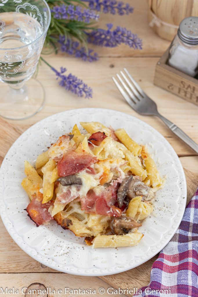 Hoy mi propuesta es una pasta al horno en blanco, sin salsa, con jamón cocido champiñones y mozzarella. Y para concluir bechamel casera, ¡otro ingrediente que no puede faltar para este plato típico!