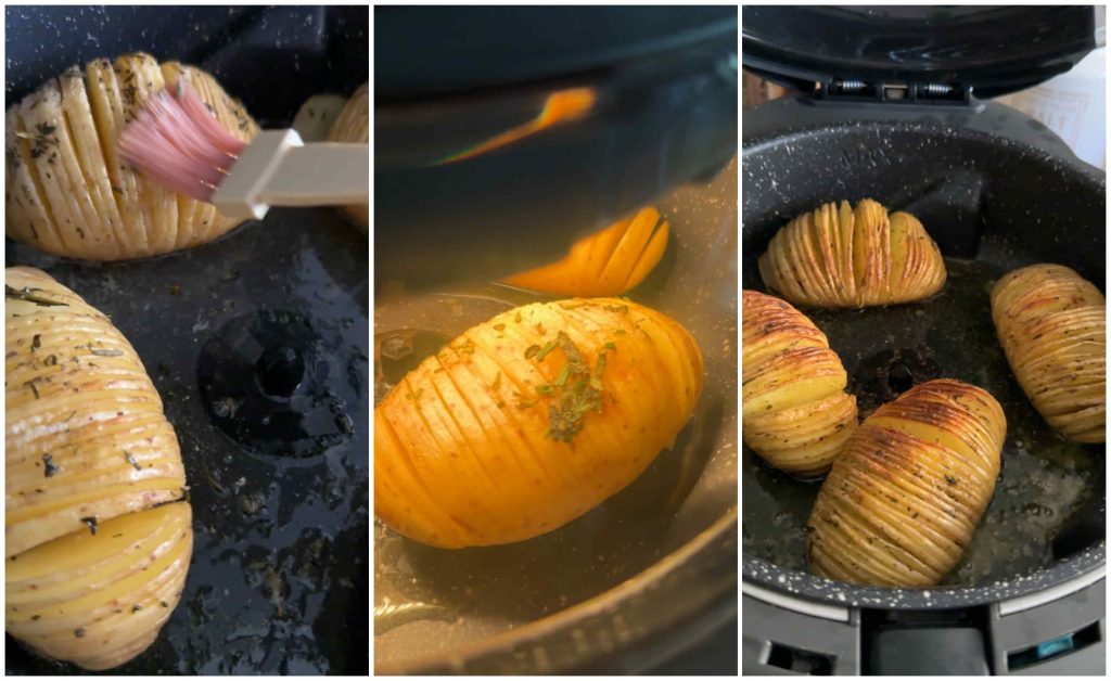 Las patatas Hasselback también se pueden cocinar en sartén o en freidora de aire, igual que hice yo al elegir usar mi Turbo Cecofry 4D Healthy.