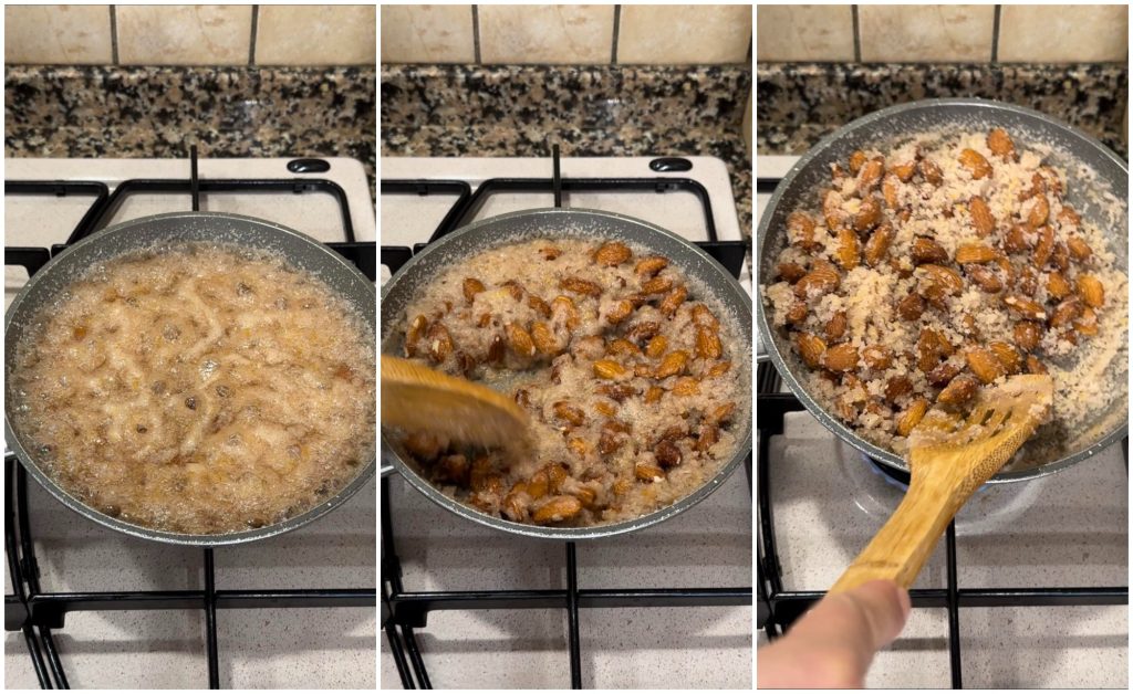 • Por favor, NO LO DEJES DERRETIR DEL TODO. En esta fase el azúcar debe adherirse a las almendras.