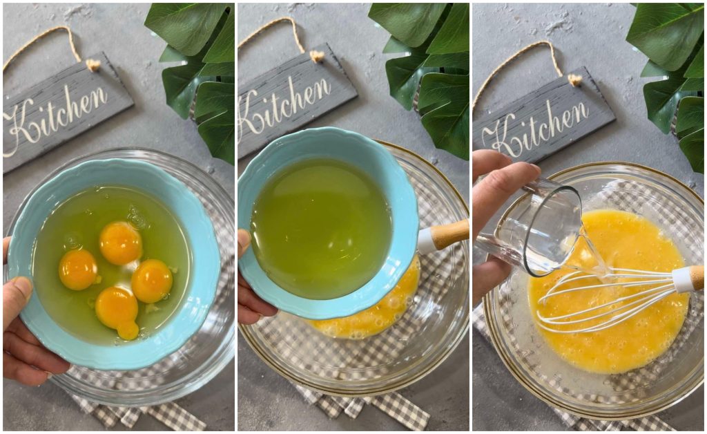 Ahora toma un cuenco y rompe dentro 4 huevos medianos enteros, bátelos por unos momentos con un batidor manual, luego añade el aceite de semillas y mezcla.