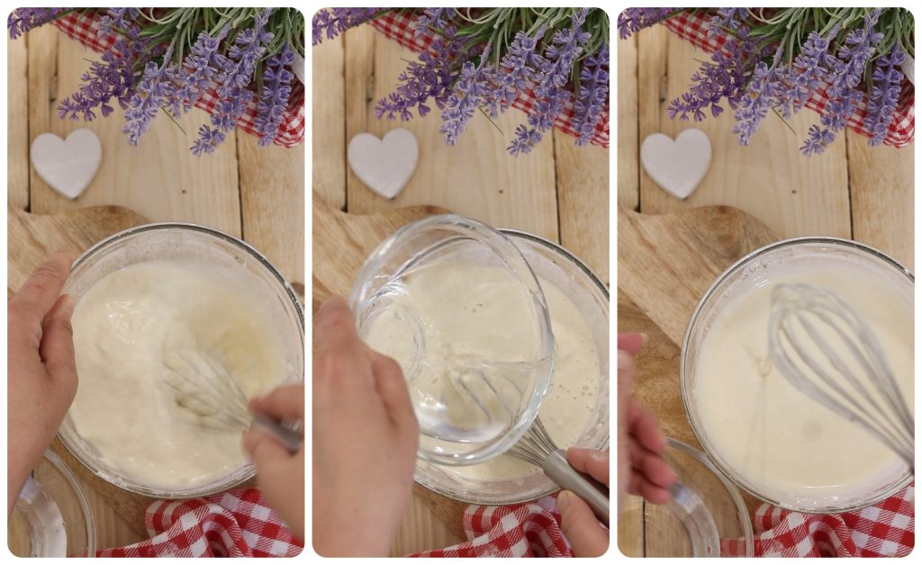 Verter dentro poco a poco el agua (a temperatura ambiente) y con un batidor de mano (o tenedor) mezclar bien.