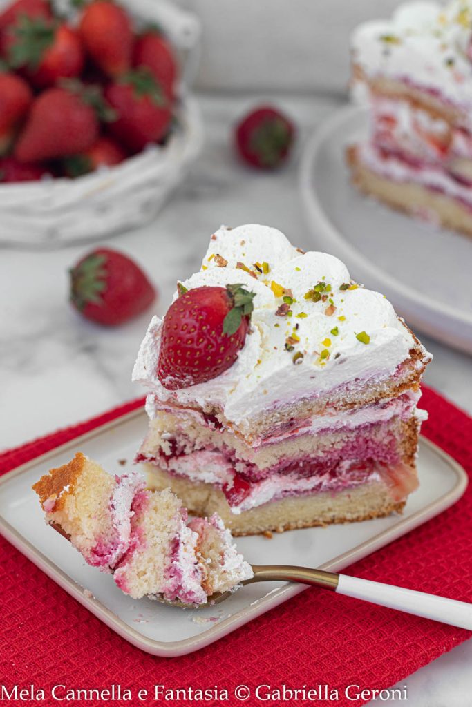 Hoy quiero mimaros con esta deliciosa Tarta de nata y fresas sin bizcocho. Es un postre aromático, de sabor envolvente que te conquista. Relleno con muchas fresas frescas cortadas en cubitos. Cubierto con suave nata montada y decorado con fresas y granillo de pistacho. Hace unos días, aprovechando las últimas fresas que todavía se encuentran por ahí, me di un capricho. Una tarta de fresas y nata escenográfica y deliciosa en recuerdo de mi querida abuela. Debes saber que, cuando comenzaba la temporada de fresas, mi abuela Aldina amaba preparar la tarta de fresas y nata. La rellenaba tanto que, cuando cortabas una rebanada, ¡las fresas se salían por todas partes! ¡Cualquier ocasión era buena para prepararla! Para un cumpleaños, para el almuerzo del domingo, para una ocasión especial. ¡A todos en casa les encantaba! Pero esta vez quise añadir un ingrediente especial para hacerla todavía más deliciosa. Finas capas de mermelada de fresas que os aseguro marcaron la diferencia. Además, gracias también al almíbar a base de Alchermes (al final encuentras cómo sustituirlo) al cortar se puede admirar el maravilloso color. La tarta original de la abuela incluía bizcocho. Yo, en cambio, he optado por una versión más sencilla y rápida, sin bizcocho. Del libro de recetas de ella, he elegido una simple pero esponjosa tarta que se adapta a cualquier tipo de relleno. El resultado es un dulce bonito de presentar, facilísimo y muy goloso. ¿No te gustan las fresas? ¡No hay problema! Esta tarta se puede hacer con la fruta que más nos guste. Melocotones, frambuesas, arándanos, kiwi, albaricoques. Incluso mi abuela hacía una variante con fresas y plátanos. ¡No os digo qué espectáculo! Pero ahora basta de charla. ¡Preparemos juntos la tarta de nata y fresas más simple y deliciosa que existe!