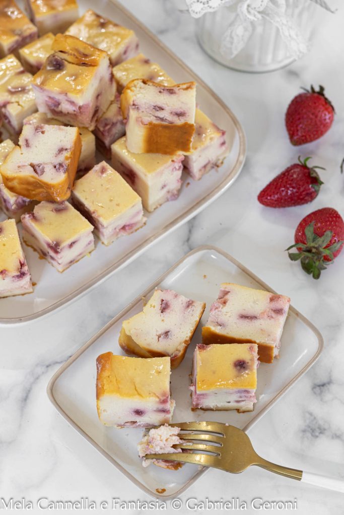 ¿Ganas de un dulce diferente a lo habitual? ¡Aquí estoy para ayudarte! ¡Preparemos juntos la tarta de queso con fresas! «¿Cómo??» «¿La tarta de queso sería un dulce diferente a lo habitual?» Sí, porque es una tarta de queso sin base de galletas, cremosa y rapidísima de hacer. Quien me sigue ya habrá visto la golosísima versión con gotas de chocolate. La tarta de queso sin base es una torta a base de queso muy suave. No se utilizan galletas para formar la base de la receta clásica. El resultado es un dulce más ligero, cremoso y delicado. Se puede personalizar de muchas maneras. De hecho, he decidido probar una versión con fruta fresca. Si no te gustan las fresas, puedes sustituirlas por la fruta que más te guste. La tarta de queso sin base es un dulce sin gluten, ideal también para intolerantes. También es sin levadura y sin mantequilla. Para una versión sin lactosa podemos usar tranquilamente los sustitutos que se encuentran en el supermercado. Esta tarta suave de fresas se prepara en un instante y no necesitarás siquiera una batidora eléctrica. Se conserva tranquilamente en el frigorífico hasta un máximo de cuatro días. Veamos juntos cómo se prepara la Tarta de queso con fresas sin base.