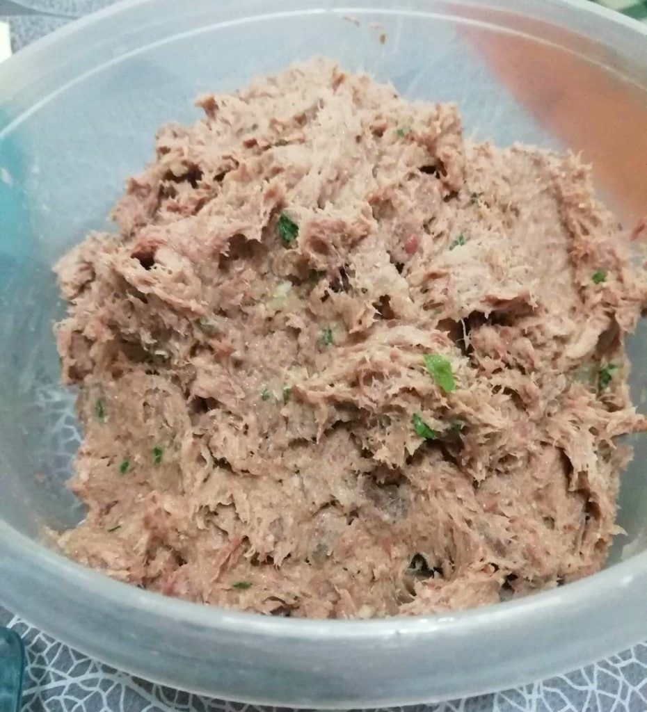 3 – Pica la carne y las patatas junto con el huevo, el queso rallado, el ajo, el perejil, la sal y la pimienta.