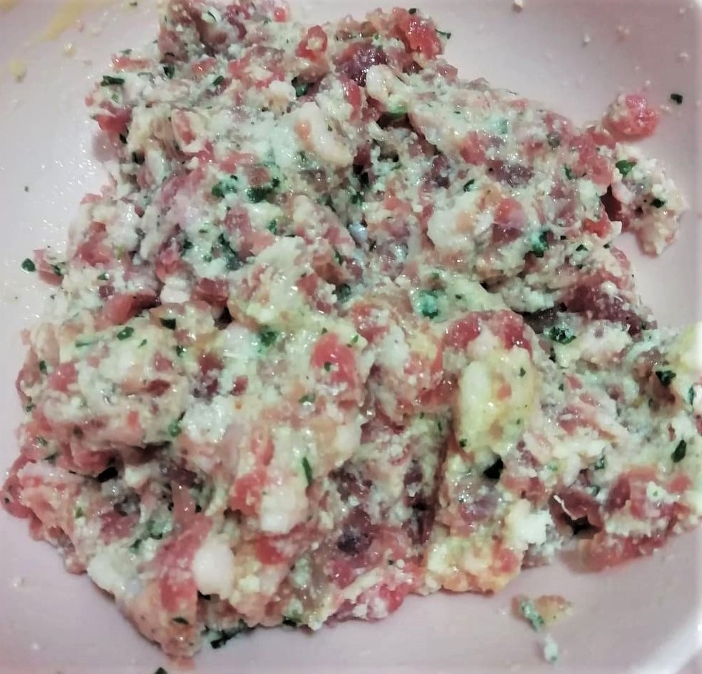 En un bol, ponga la salchicha desmenuzada, la yema de huevo, el parmesano rallado, el perejil picado, sal y pimienta molida y amase la mezcla.
