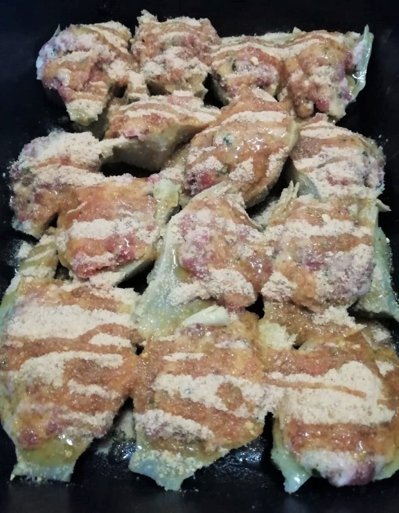 • Rellene las mitades de alcachofas escaldadas con una cucharada del relleno y colóquelas en una bandeja de horno ligeramente aceitada. Coloque también los tallos en la bandeja, entre una alcachofa y otra.