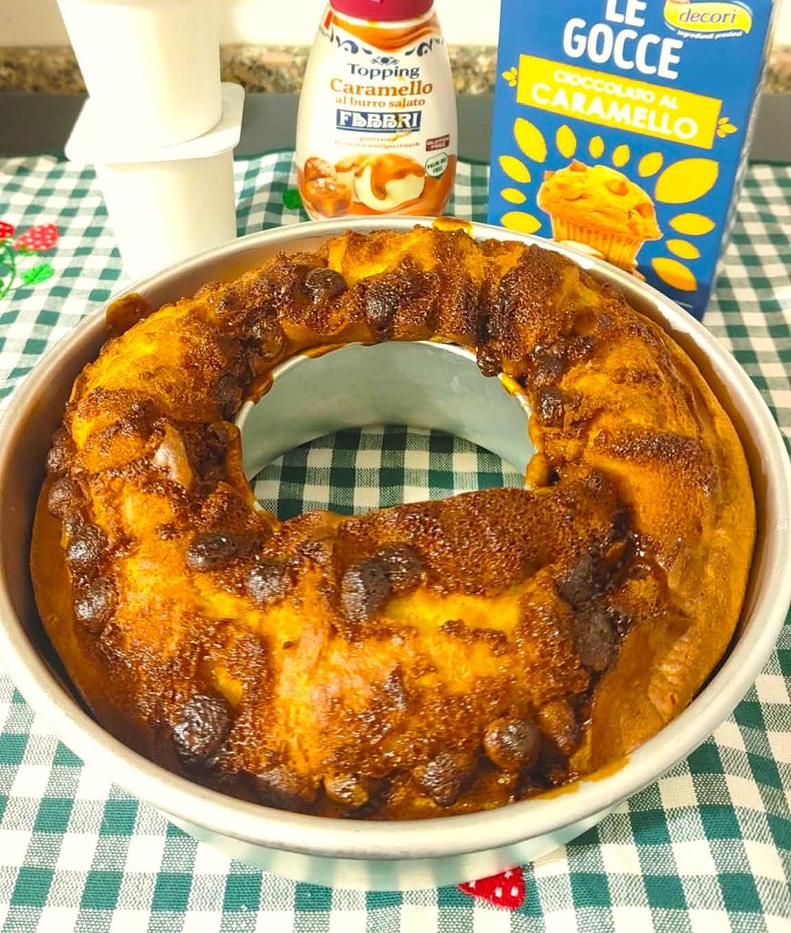 Si quieres un postre sencillo y esponjoso como una nube, este bizcocho de yogur con gotas de chocolate de caramelo es la elección perfecta. Suave, aromático y enriquecido con gotas de chocolate de caramelo y un delicioso topping de caramelo salado. Es ideal para el desayuno, la merienda o como postre de última hora y la preparación es facilísima si utilizas la freidora de aire, pero si prefieres puedes usar también el horno tradicional.