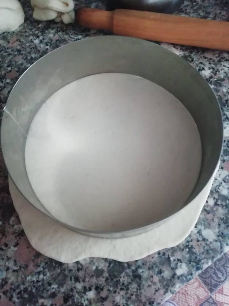 Enharinad la superficie de trabajo y terminad de amasar la masa hasta que se vuelva lisa y homogénea. Colocadla en el bol, cerradlo con film transparente y dejadla levar hasta que doble de tamaño.Picar la mozzarella y dejarla escurrir. Con una batidora, o a mano, picad groseramente el jamón cocido y la mortadela, y los unís a la mozzarella y al parmesano rallado. Añadid una pizca de pimienta y sal.