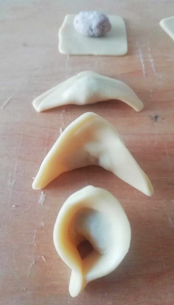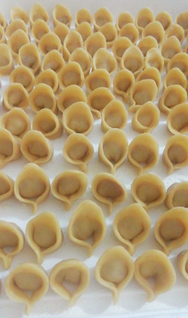 3- Finalmente, gira el capellini sobre el dedo y une entre sí las dos extremidades, dejando arriba la punta central (como en las fotos).