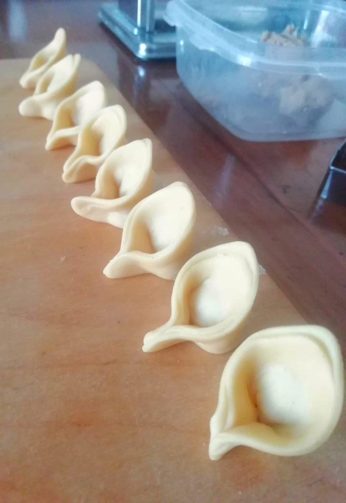 Preparamos los capellini de carne en caldo o secos con una crema de nata blanca. Como habrán visto en la foto, la forma no es la clásica del cappelletto romagnolo ni del tortellino emiliano.